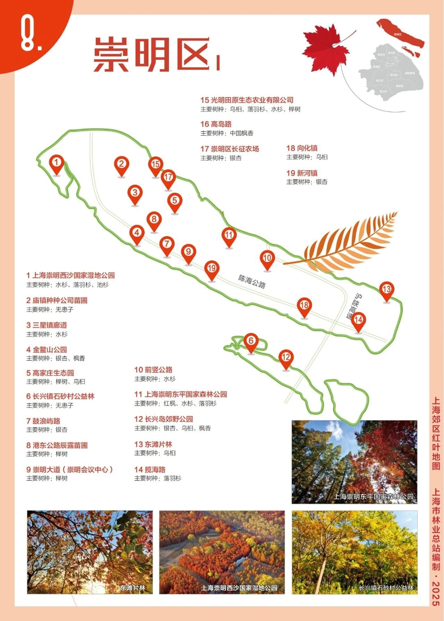 冷空气南下后,一直在植物中“隐秘而居”的叶黄素、胡萝卜素和花青素就有了大放异彩的机会。昨天,上海市林业总站发布了新鲜出炉的“2025上海郊区红叶地图”,覆盖本市9个郊区的多元观赏点。
