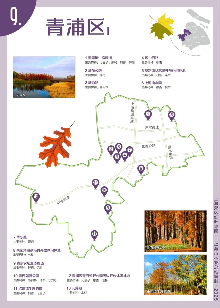 升级版地图包括浦东、闵行、松江、金山、奉贤、嘉定、宝山、崇明、青浦等9个郊区,图中不仅标有观赏点位,也标注着主要观赏树种及部分点位的秋色照片。据悉,图中观赏点相当多元,不仅有焕新颜的经典地标,也有待探索的小众秘境,按区提供赏秋指南。