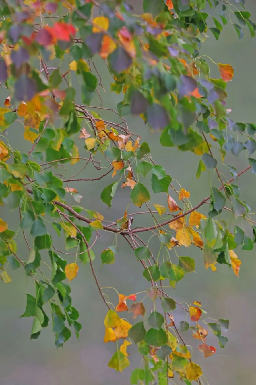 乌桕。乌桕在秋天往往呈现缤纷多样的色彩,独特而纤薄的菱形小叶片十分精致可爱。